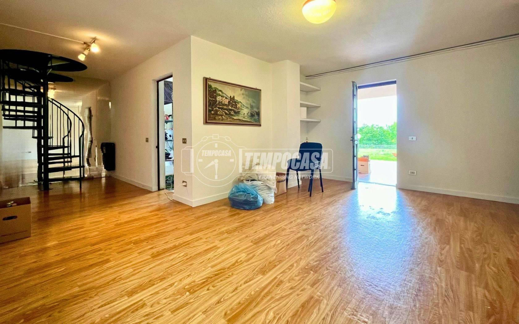 Una scala a chiocciola, collegata internamente dalla cucina, conduce al piano inferiore, dove si sviluppano una taverna con accesso diretto al giardino, una lavanderia, un secondo bagno, e uno studio/zona hobby, ideale come palestra, spazio creativo o home office, grazie anche alla grande portafinestra a tutta parete che dona luce naturale e continuità con l’esterno.