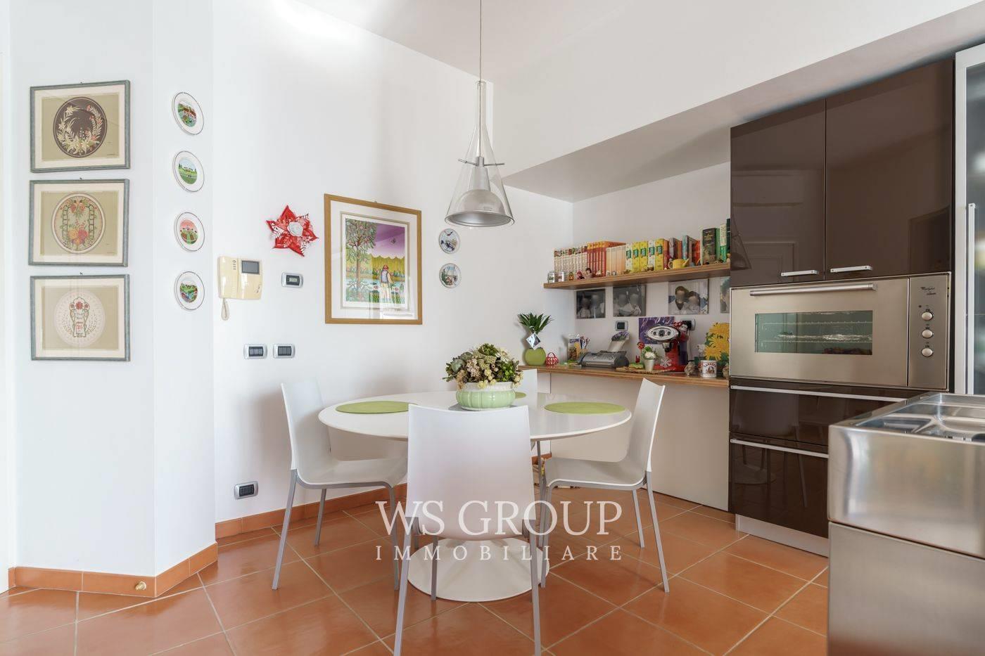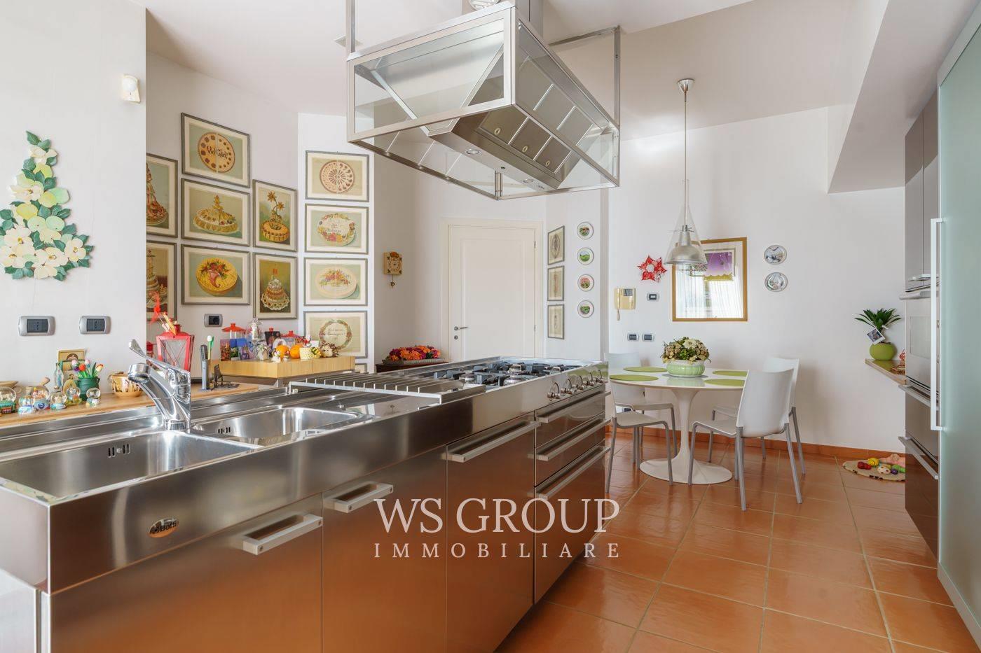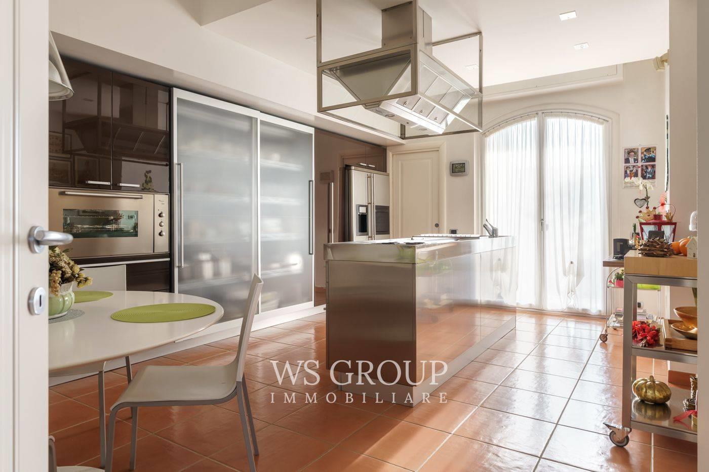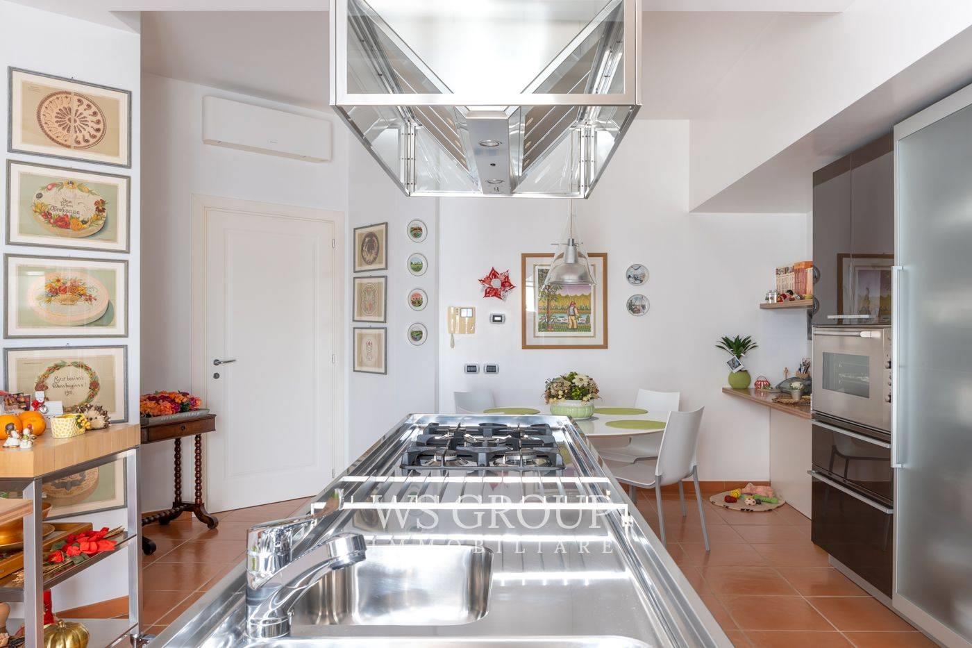 La grande cucina abitabile, funzionale e completamente realizzata su misura, è esaltata da una raffinata isola all’americana. Le linee eleganti firmate Boffi e un pratico locale di servizio adiacente consentono di ampliare le superfici operative senza appesantire l’ambiente principale.