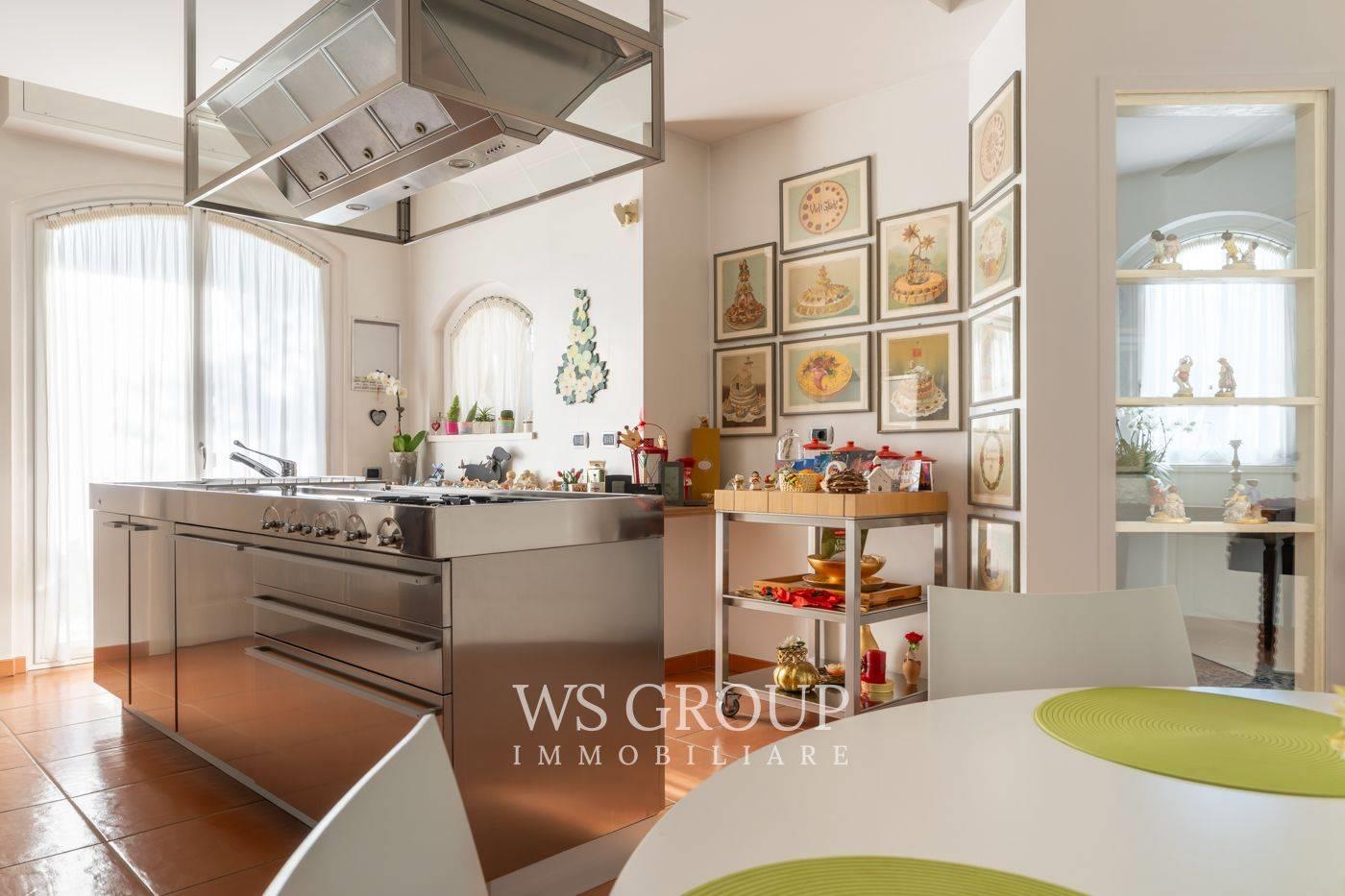 La grande cucina abitabile, funzionale e completamente realizzata su misura, è esaltata da una raffinata isola all’americana. Le linee eleganti firmate Boffi e un pratico locale di servizio adiacente consentono di ampliare le superfici operative senza appesantire l’ambiente principale.