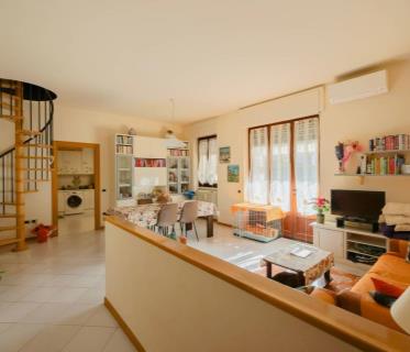Al piano terra, l’immobile accoglie con una spaziosa cucina abitabile e un soggiorno luminoso, perfetti per vivere la quotidianità in famiglia. Una comoda scala interna collega al piano primo, dove si trovano due ampie camere da letto, entrambe con affaccio su balcone, che regalano luce e apertura agli ambienti.