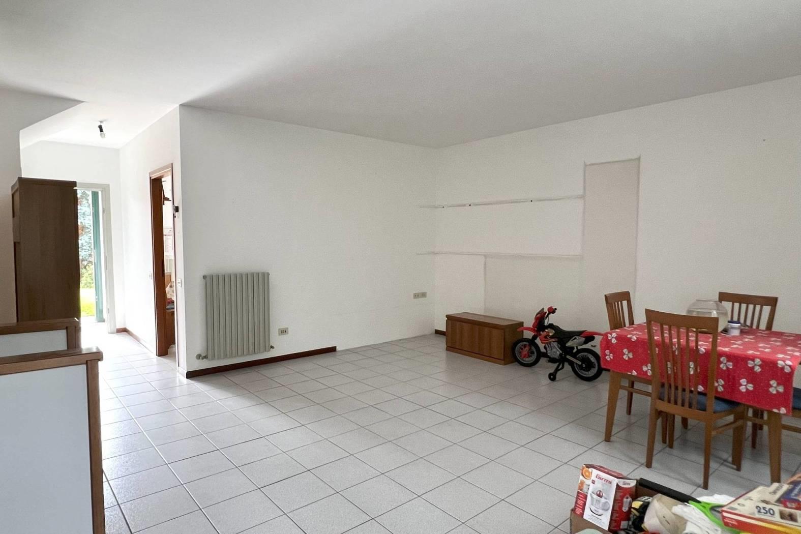 L’ingresso dell’abitazione proposta avviene da una doppia porta (un portoncino blindato ed una porta a vetri) che introduce al piano giorno così composto: ampio soggiorno con uscita sull’area esterna retrostante, cucina abitabile e bagno di servizio.