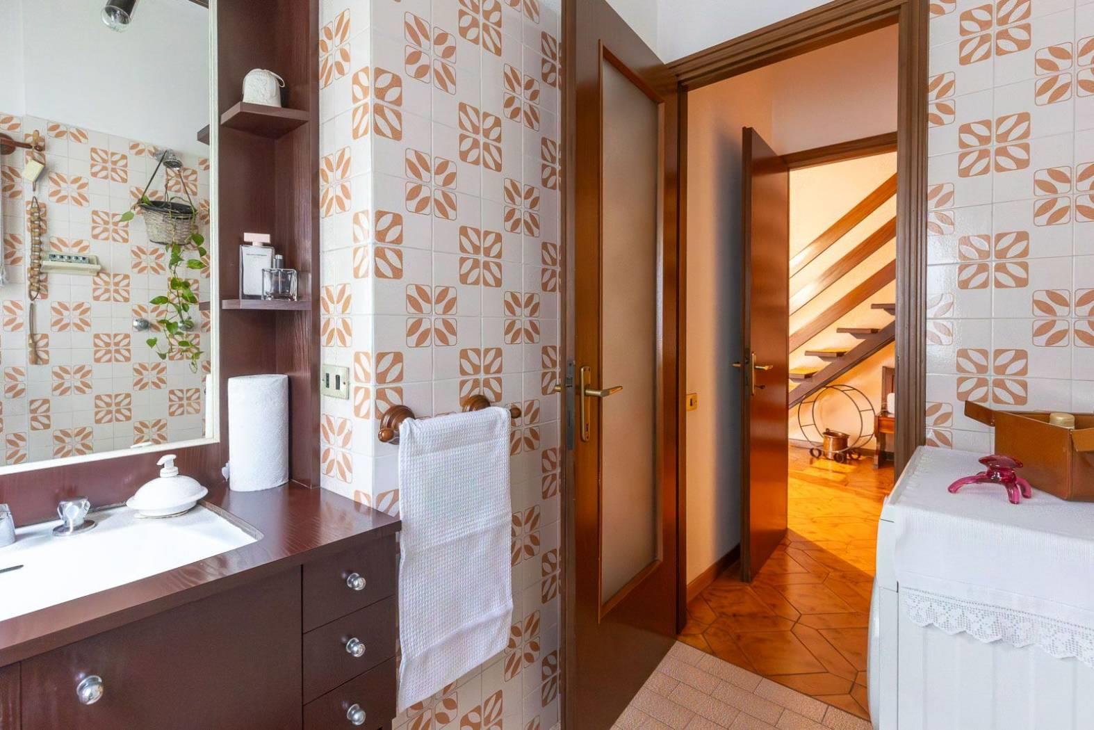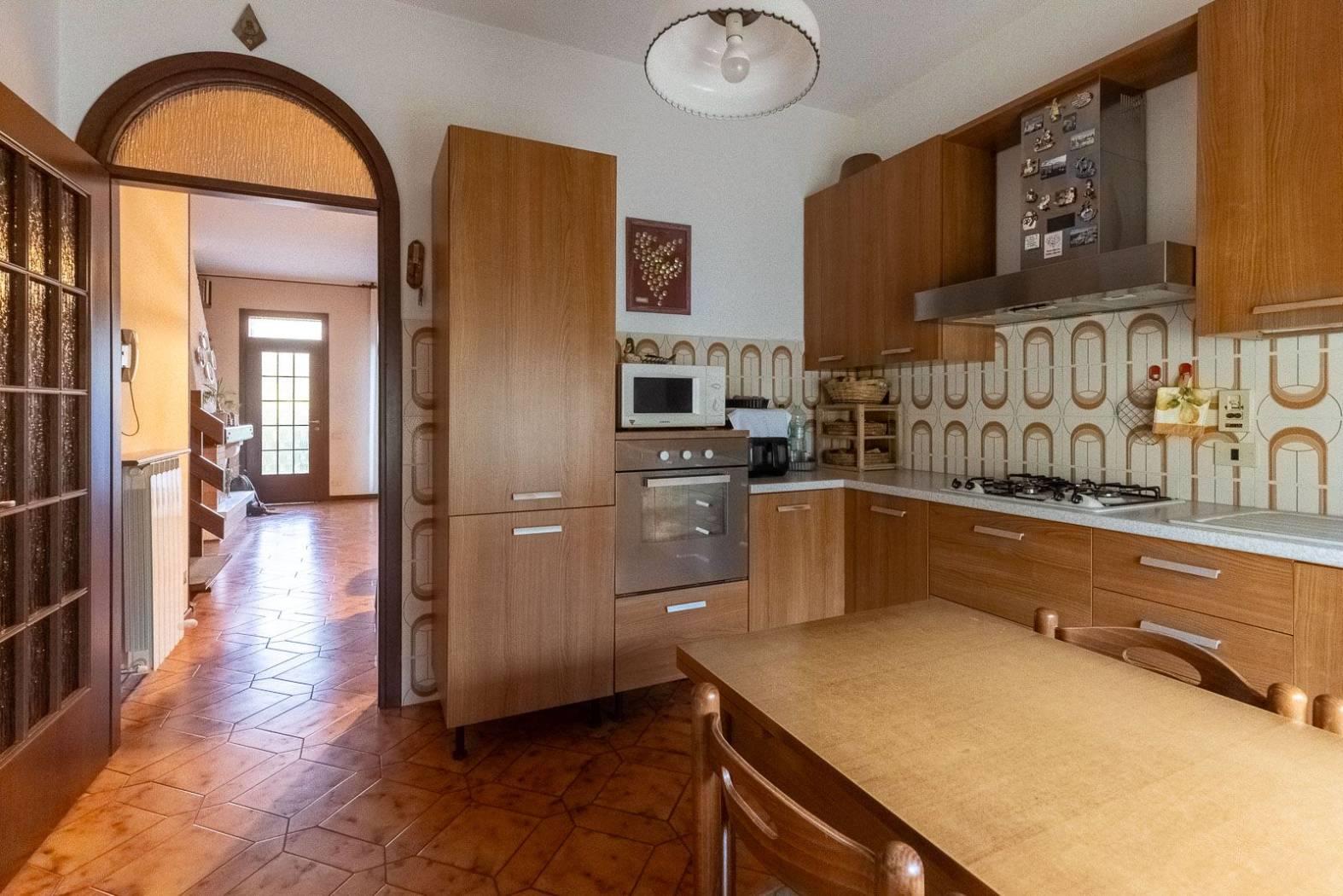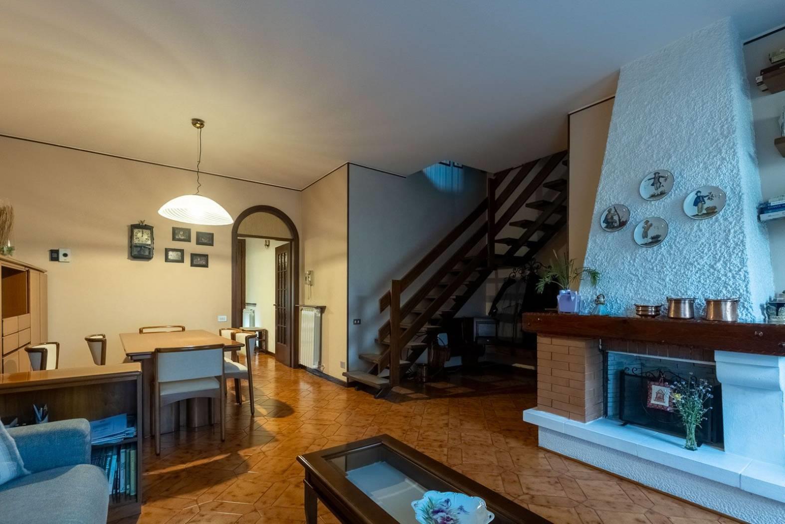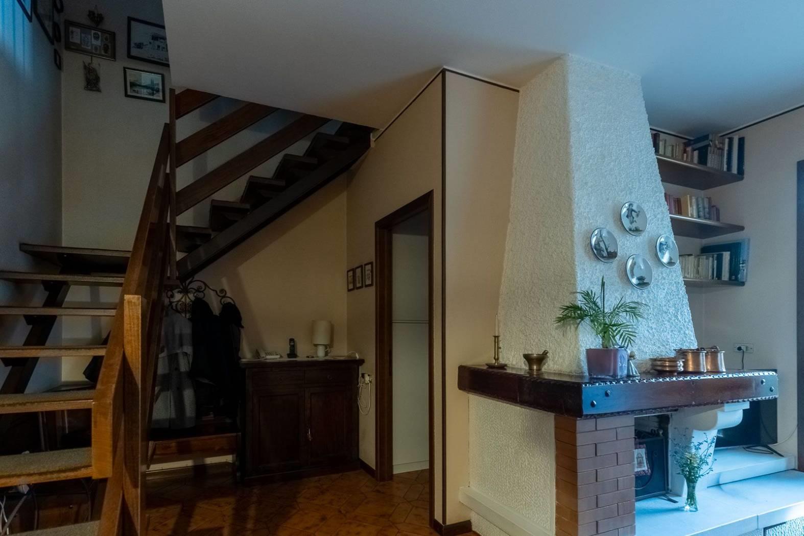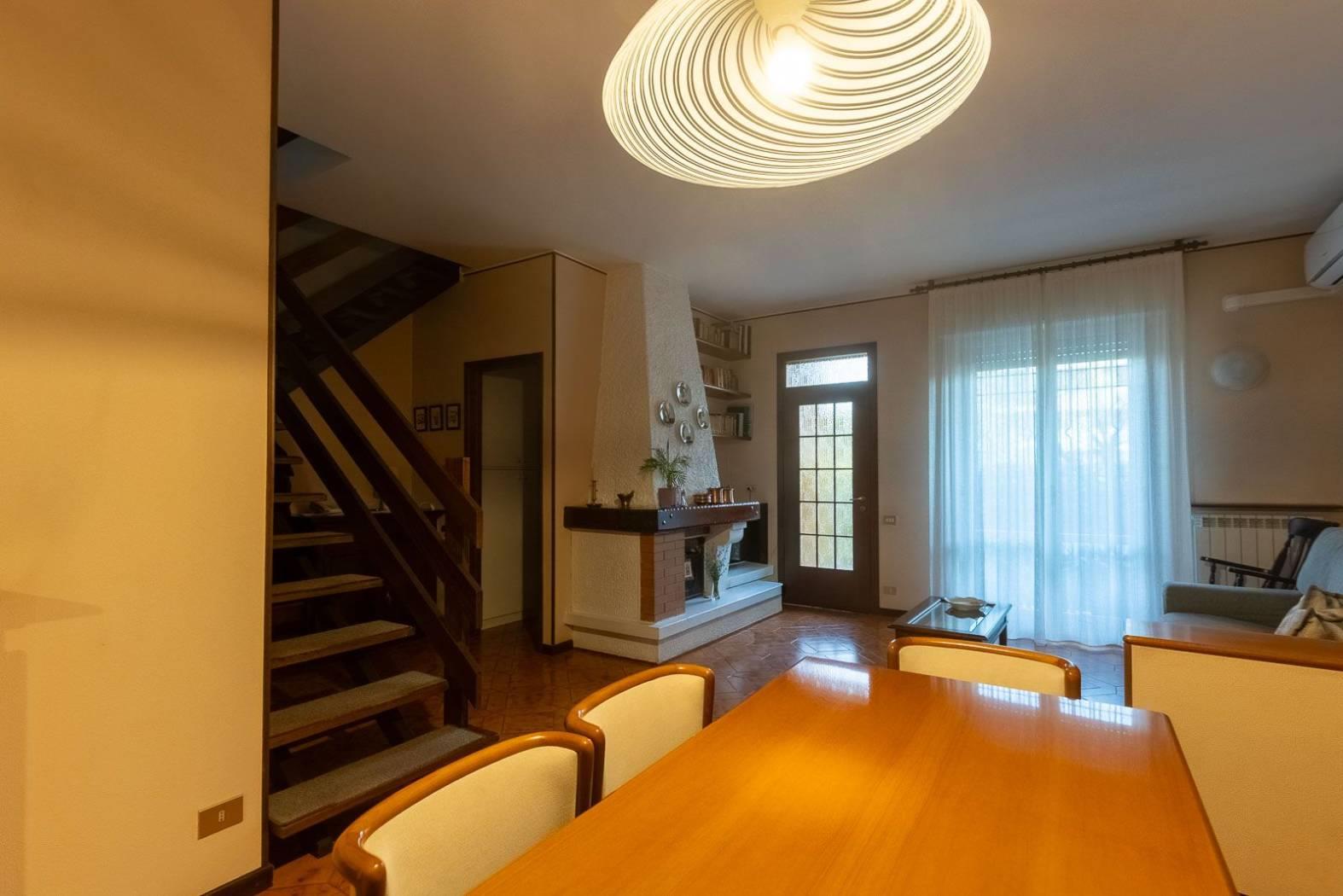 PIANO TERRA: zona giorno con sala e camino (con comignolo nuovo), cucina abitabile, accesso diretto al giardino fronte e retro e bagno