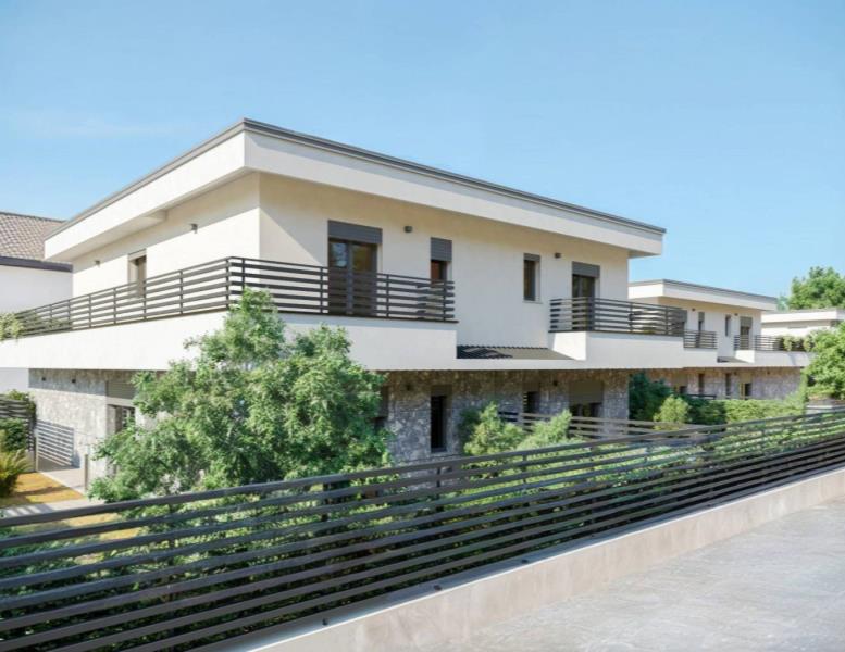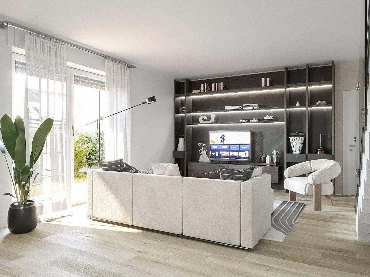 DESCRIZIONE. La soluzione si apre al piano terreno su una comoda zona living con cucina di circa 50 mq che si collega alla perfezione da un’ampia porta finestra al giardino, riservato e ideale per una veranda e/o gazebo (diventando un prolungamento naturale della zona giorno), possibilità di dividere quest’ambiente, creando un’ampia cucina e una zona living che non ha nulla da invidiare alle soluzioni più datate in quanto a metrature; completa il piano il primo bagno di servizio. Al piano superiore trovano spazio, un comodo corridoio che collega tre camere, un ampio terrazzo (sovrastante al box) e bagno padronale. Tutte le finiture sono personalizzabili con un’ampia scelta di capitolati: il gres porcellanato effetto legno, cemento, pietra e resina. Per quanto riguarda le tecnologie presenti sono tutte di ultima generazione: riscaldamento a pavimento e predisposizione per l’aria condizionata in tutte le stanze, predisposizione impianto d’antifurto e un impianto fotovoltaico di 1,6 kw dedicato a ogni proprietà con possibilità di aumento. Tutti ovviamente dettagli che portano l’immobile ad ottenere una efficienza energetica di classe A. ESPOSIZIONE SUD-EST-NORD