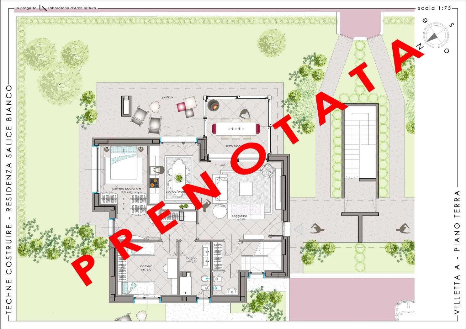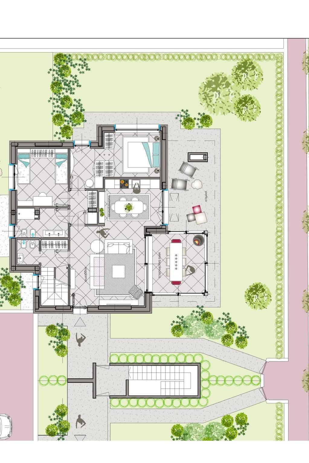 La soluzione qui proposta, prevede un appartamento con giardino di proprietà, portico e serra bioclimatica.