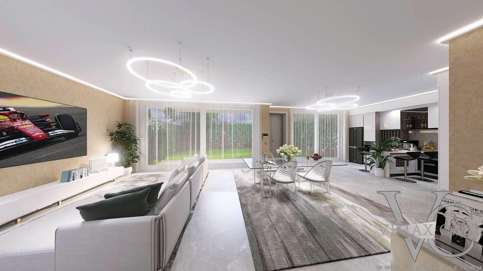 Un’unica, spettacolare zona living open space è abbracciata da grandi vetrate a tutt’altezza che inondano l’ambiente di luce naturale e offrono una vista immersiva sull’elegante giardino di proprietà.