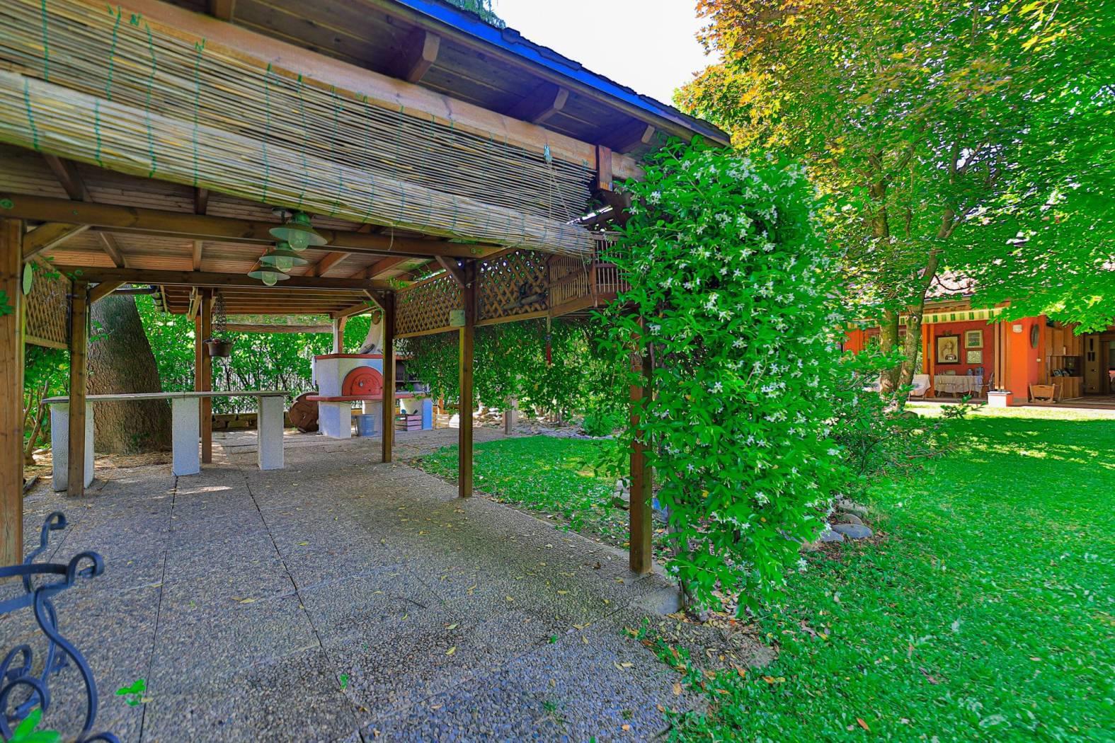 Fiore all’occhiello del giardino è un romantico berceau (regolarmente accatastato) con camino e forno a legna, ideale per cene all’aperto e momenti di convivialità, oltre a una casetta in legno per il ricovero attrezzi.
