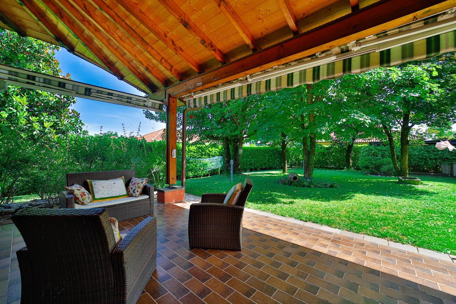 Fiore all’occhiello del giardino è un romantico berceau (regolarmente accatastato) con camino e forno a legna, ideale per cene all’aperto e momenti di convivialità, oltre a una casetta in legno per il ricovero attrezzi.