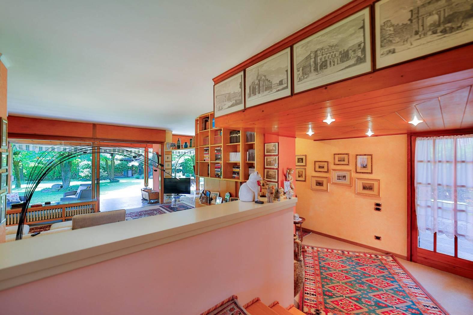 L'ingresso conduce a una spettacolare zona giorno doppia, dove l’atmosfera avvolgente degli ambienti dialogano con la luce naturale delle ampie vetrate, affacciate su una splendida veranda di 35,00 mq: un angolo perfetto per ogni stagione, nascosto tra le linee della zona giorno, un intimo salottino con camino accende l’atmosfera con il tepore delle fiamme e regala il piacere di una lettura serena, al riparo dal mondo. La cucina abitabile, anch’essa con accesso diretto al portico, è ideale per chi ama ricevere e vivere la casa nella sua totalità.